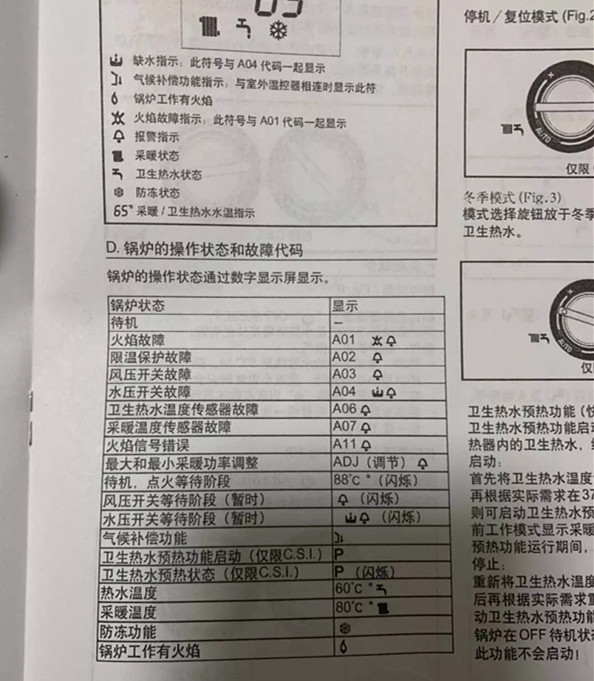 A01----火焰故障:先檢查燃?xì)忾y門是否打開,每當(dāng)需要供暖或生產(chǎn)生活熱水時(shí),鍋爐自動(dòng)開啟。若10秒內(nèi)燃燒器沒有啟動(dòng),鍋爐進(jìn)入“點(diǎn)火鎖死”狀態(tài)(代碼A01)。如需解除“點(diǎn)火鎖死”狀態(tài),必須關(guān)掉壁掛爐重新啟動(dòng)。首次啟動(dòng)時(shí)或長(zhǎng)期停用后,必須解除“點(diǎn)火鎖死”狀態(tài)。若上述情況經(jīng)常發(fā)生,請(qǐng)與售后服務(wù)中心400-998-1270聯(lián)系。